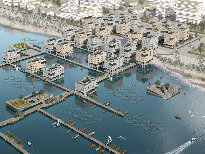 通過和大海建立良好的互動關系,市民們將享受到熱帶雨林公園,運河,湖水和沙灘。區(qū)域規(guī)劃將主要致力于沿海社區(qū),使?jié)O業(yè)可以蓬勃發(fā)展。漁民們的住宅集合地附近將有空間方便船只???。此外,通過建造巨型海堤來幫助雅加達地區(qū)免受洪水的侵襲。
