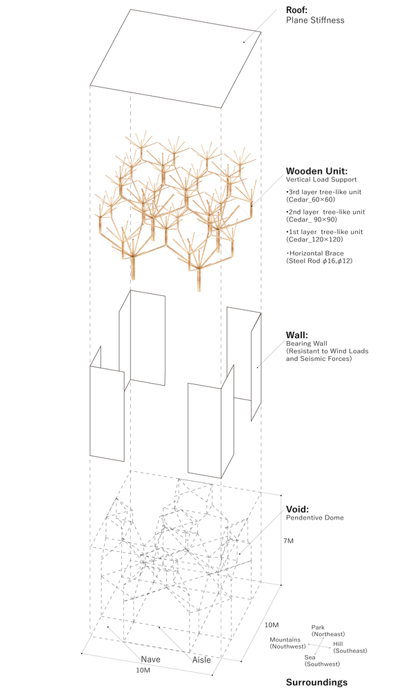 四角的承墻墻體承擔(dān)水平力,內(nèi)部木單元支撐屋頂負(fù)荷,可達(dá)25噸。
