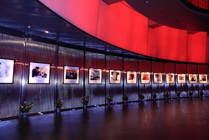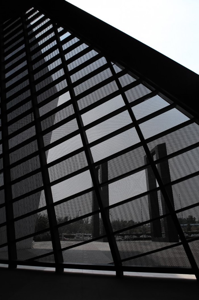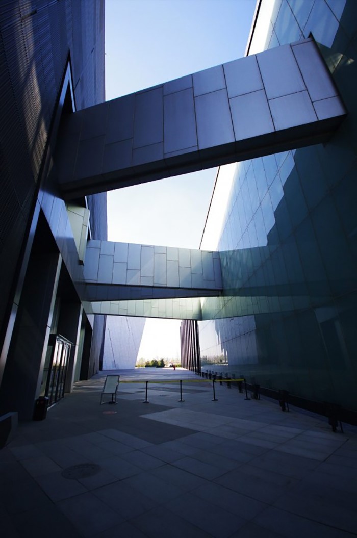 中國電影博物館的建筑外觀不僅氣勢宏偉,而且充滿了獨特的藝術特色。在主體建筑的前方,巨大的銀幕與廣場上一道斷續(xù)的斜墻構成了形如咔打板的平面組合。建筑采用黑色作為基礎色,并使用鏤空圖案的金屬板作為外層裝飾,為這座光影的殿堂蒙上了神秘的面紗。在統(tǒng)一、中性的黑色背景上,四個立面根據(jù)建筑的內(nèi)部公共空間的位置分別開辟一片大型彩色玻璃面。紅、綠、藍、黃分別代表的展覽、博覽、影院、綜合服務四個中國電影博物館大廳功能區(qū)域流露出多彩的個性。