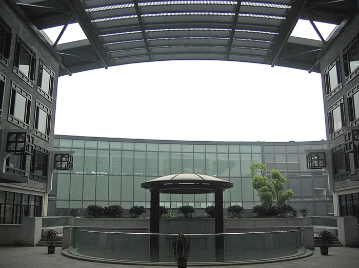 新校區(qū)在群體布局上強調(diào)“通”、“透”、“空”,強調(diào)與景園共享相融的復合建筑空間構(gòu)成,借用江南建筑特有的高墻、深院、窄巷等處理手法,引導縱深的可視層次,使校園環(huán)境的致密與通透達成一種多變的對比和反差,使人們領略空間的開放與流暢。以適應地域性自然人文環(huán)境、富有傳統(tǒng)建筑文化特色的方式,化解了用地狹小、建筑密度過高所易于導致的空間擁堵感。