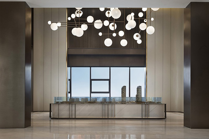 沙盤區(qū)上方的大型燈光裝置、磨砂的質(zhì)感和疏密有致的排布,是現(xiàn)代手法演繹的華美曼麗。整體空間有變化、有層次、有一種內(nèi)在的豐富,無論是色彩的轉(zhuǎn)折,還是材質(zhì)的替換,一切都是發(fā)生在自然而然間的,變換間又回到純粹、簡潔的本質(zhì),但感受卻是無限的,是自由不拘的。