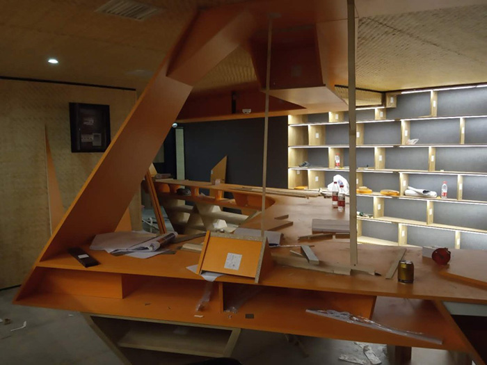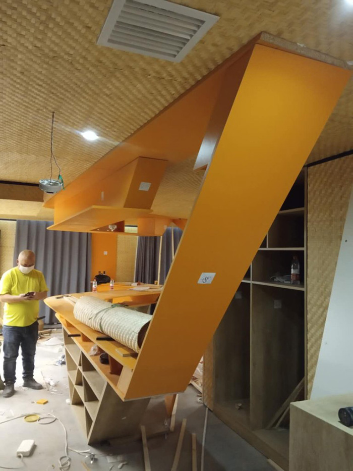 這個(gè)項(xiàng)目是朋友邀約的會(huì)所室內(nèi)設(shè)計(jì)。使用壁布,竹席,涂料等材料,以30萬左右的造價(jià)來實(shí)現(xiàn)大廳,樓梯間,辦公,餐廳,廚房等不同空間的不同體驗(yàn)。這個(gè)項(xiàng)目目前已經(jīng)接近竣工。大廳的吧臺(tái)是一個(gè)家具,也是一個(gè)裝置藝術(shù),由作為空間劃分的手段。