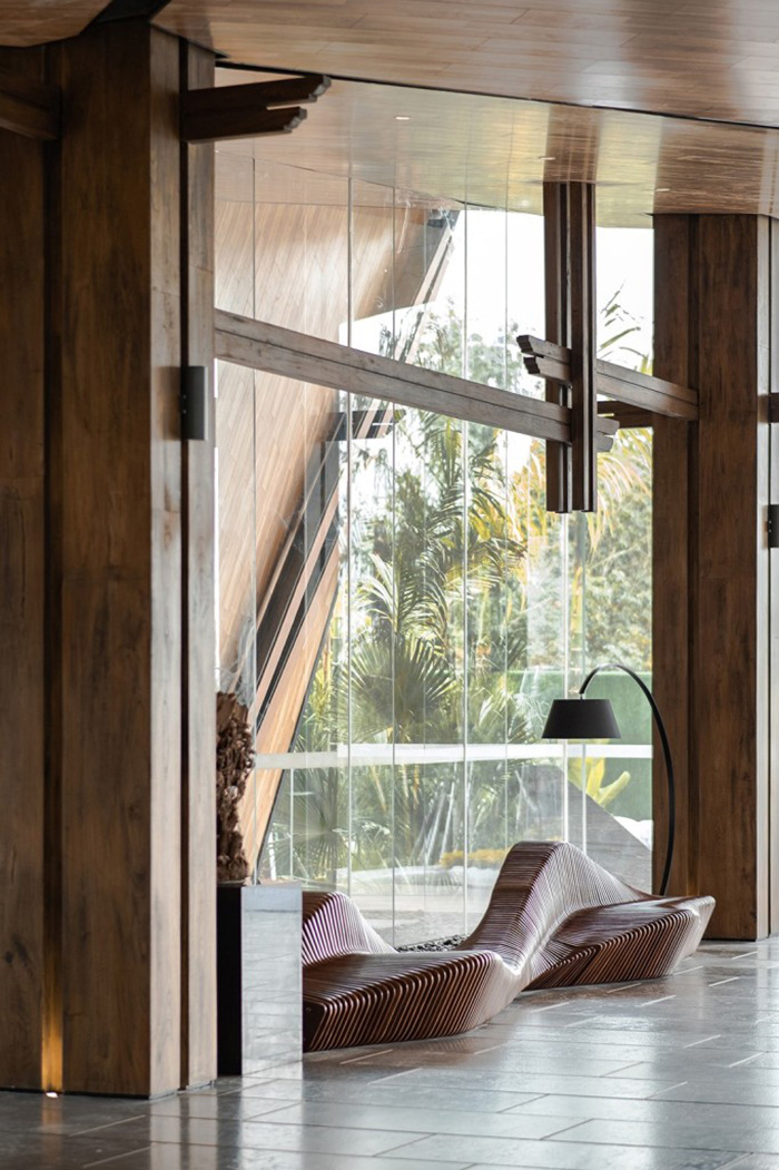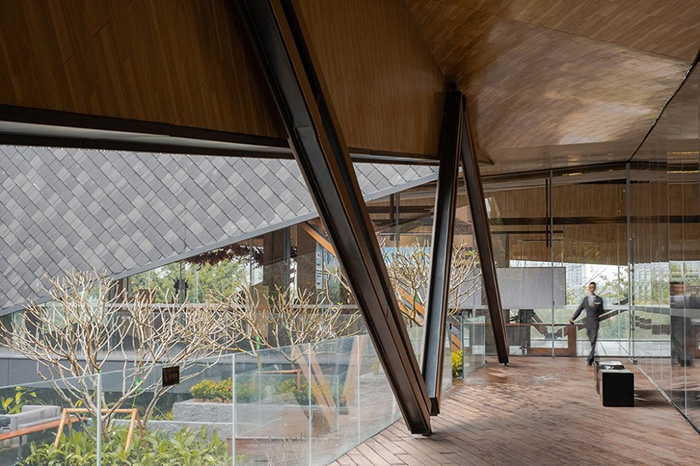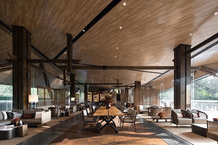 建筑設計通透開放,自由的屋頂結合靈活的異形結構,同生機勃勃的自然環(huán)境相融共生。室內(nèi)延續(xù)建筑所賦予的意義,以其為載體,在室內(nèi)空間延展、重組,詮釋其所構成的涵義。